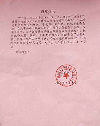 鎮(zhèn)江市公共交通有限公司第二分公司對(duì)陳偉同志的救助行為予以嘉獎(jiǎng)通報(bào),并進(jìn)行了獎(jiǎng)勵(lì)。公司鑒于該同志認(rèn)真負(fù)責(zé)的工作態(tài)度、較強(qiáng)的責(zé)任心、遇事果斷處置的良好表現(xiàn),給予通報(bào)表揚(yáng),并獎(jiǎng)勵(lì)500元。各部門、分公司要號(hào)召全體員工向陳偉同志學(xué)習(xí)。