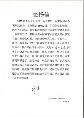 銀行方對保安員陳雙軍拾金不昧的高尚品德給予了充分肯定,專門給公司發來了表揚信。