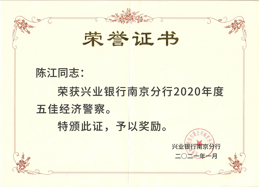 陳江,男,1979年6月出生,江蘇鎮江人,大專學歷,1997年光榮入伍,2001-2008年參加吉林省軍史編寫,期間因表現突出榮獲三等功,2008年加入中國共產黨,現為鎮江市保安服務有限公司駐興業銀行分隊的一名保安隊員。從事保安工作10年多來,他因業績突出、表現優異,受到公司和服務單位的廣泛好評,先后多次獲得公司“先進個人”,興業銀行南京分行全省“五佳經濟警察”稱號,全省僅有五名同志獲此殊榮。