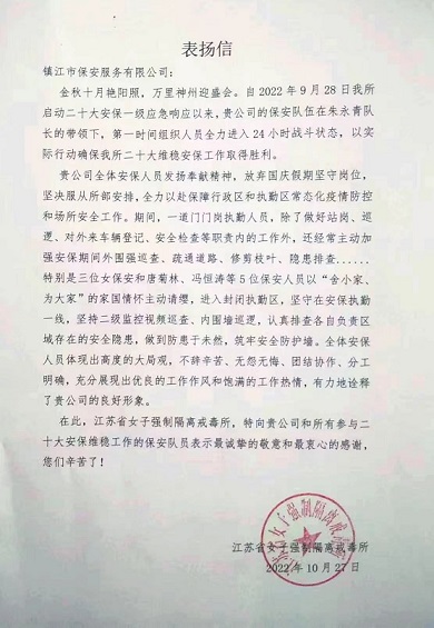 2022年10月27日,公司收到江蘇省女子強制隔離戒毒所發來的《表揚信》,對在黨的二十大期間維穩安保工作中愛崗敬業、認真履職的保安隊員給予表揚。