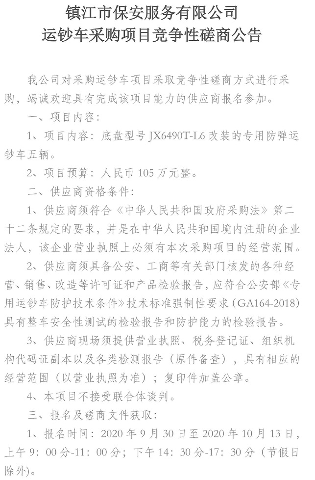 鎮江市保安服務有限公司 運鈔車采購項目競爭性磋商公告