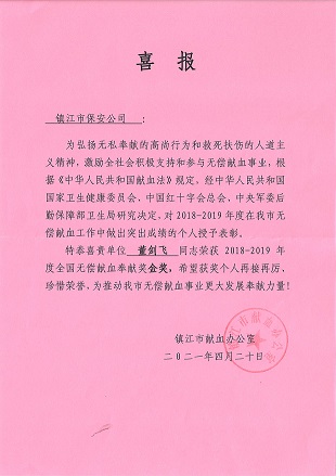 近日,鎮(zhèn)江市保安服務(wù)有限公司保安隊員董劍飛同志榮獲了由國家衛(wèi)生健康委員會、中國紅十字總會、中央軍委后勤保障部衛(wèi)生局聯(lián)合頒發(fā)的“2018-2019年度全國無償獻血奉獻獎金獎”。該獎是對獻血8000毫升以上的人士頒發(fā)的國家級貢獻獎。