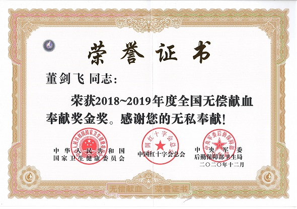 董劍飛同志自2006年起,堅持每年多次無償獻血和獻血小板。榮譽的獲得是對他捐獻熱血、無私奉獻的充分肯定,也是他對造福社會、貢獻社會、大愛無彊人生價值的體現(xiàn)。