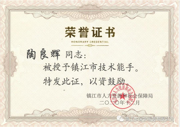 周俊、陶良輝、姚明明三名同志分別獲得武裝押運工種、人力防范工種、安全技術(shù)防范工種的第一名,并獲頒鎮(zhèn)江市人力資源和社會保障局授予“鎮(zhèn)江市技術(shù)能手”榮譽稱號。
