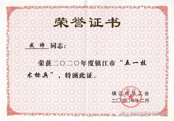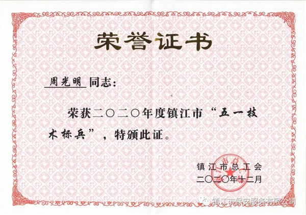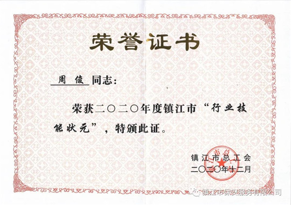 因周俊同志在競賽中表現(xiàn)突出,由市總工會授予該同志“行業(yè)技能狀元”及“鎮(zhèn)江市五一勞動獎?wù)隆睒s譽稱號。