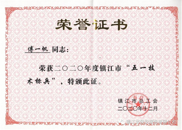 楊溢、吳文浩、朱斌三名同志分別獲得武裝押運工種、人力防范工種、安全技術(shù)防范工種的第四,并獲頒總工會授予“鎮(zhèn)江市五一技術(shù)標兵”榮譽稱號。